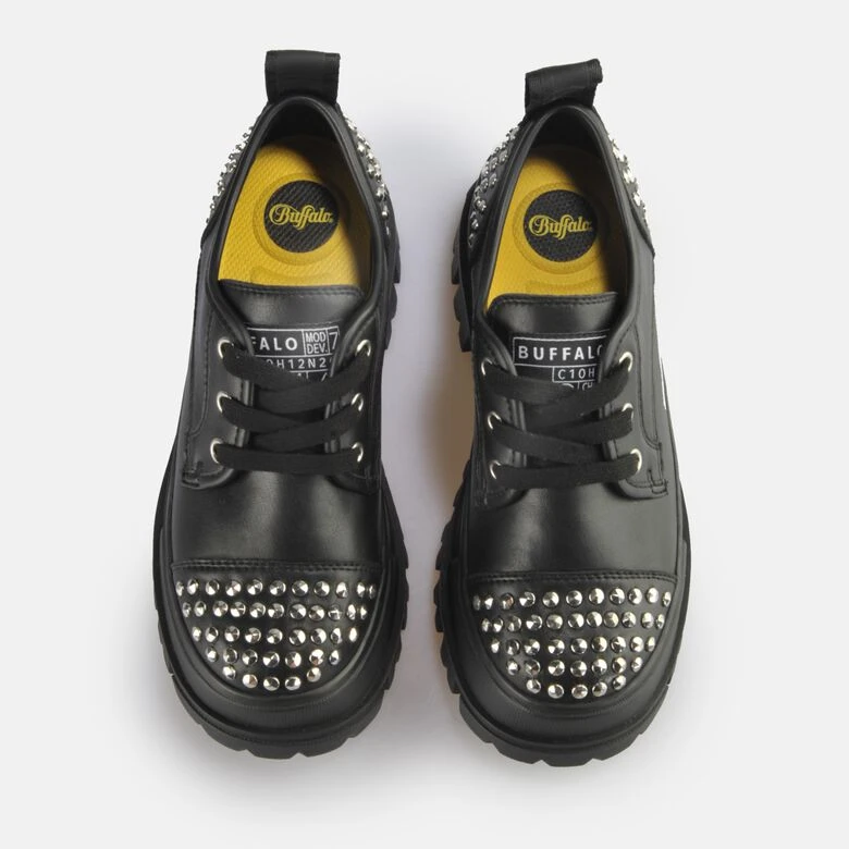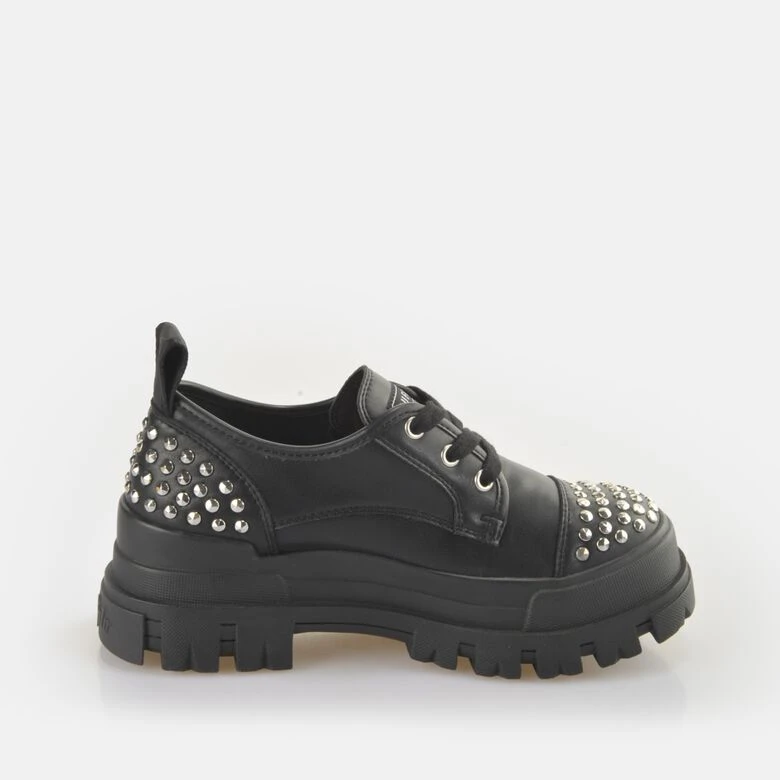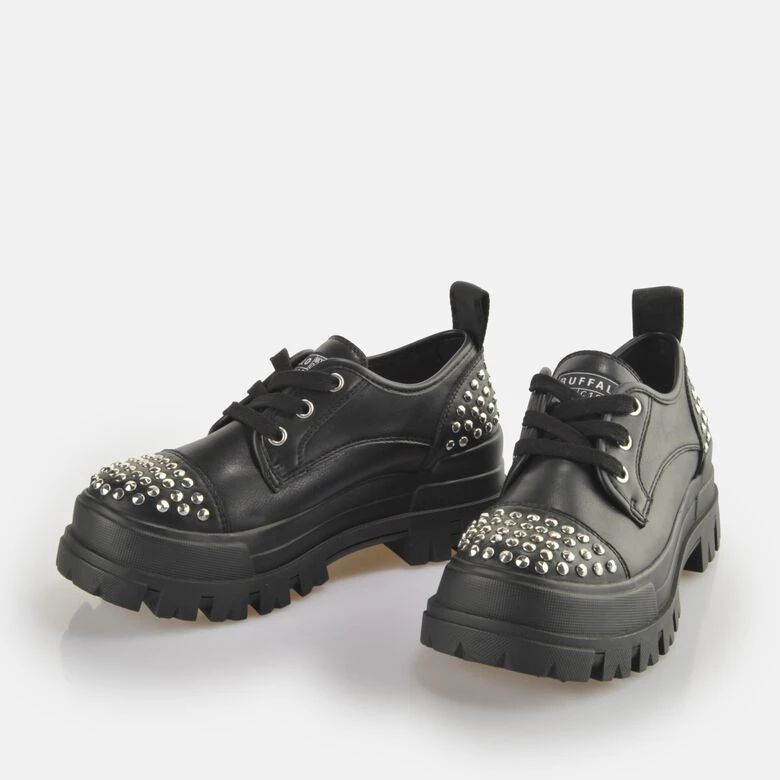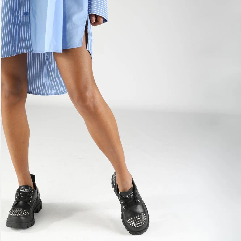 Ziehe mit dem chunky Aspha CLS Pin Halbschuh alle Blicke auf Dich! Der vegane Klassiker kommt in einem schwarzen Design mit stylischen Nieten auf der Front und an der Ferse. Bei diesem Loafer wird Eleganz mit punkigen Details zu einem einzigartigen Style kombiniert. Die herausnehmbare Decksohle aus Memory Foam sorgt für einen weichen Walk. Trag die stylischen Halbschuhe zu lässigen Wide-Leg-Jeans.