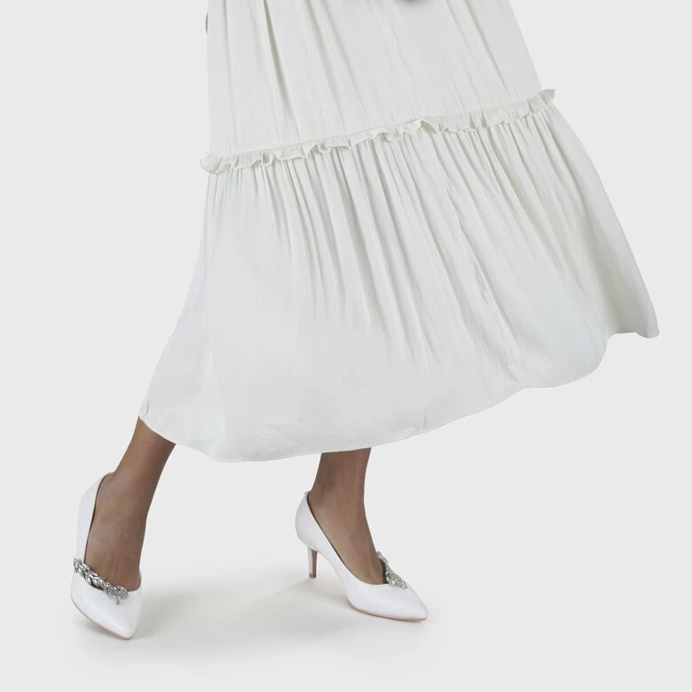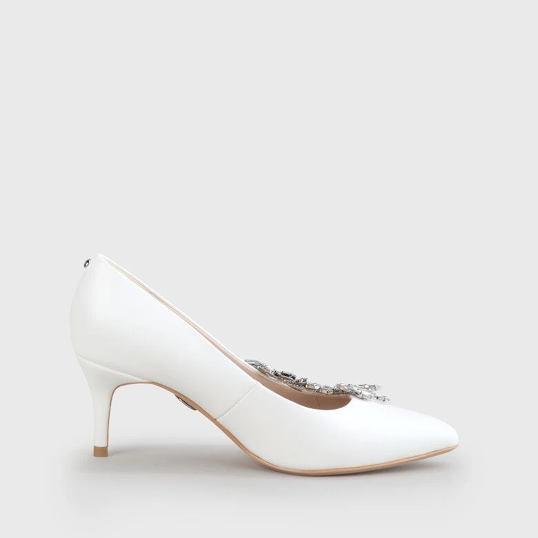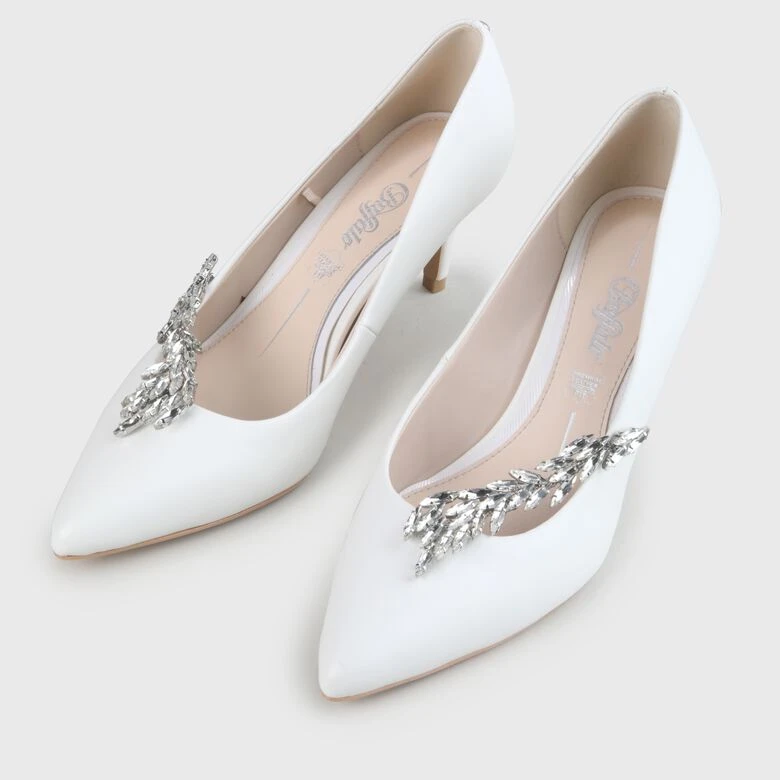 Mit dem Isabelle Pump bist Du an Deinem großen Tag als Braut doppelt verliebt und kannst würdevoll zum Altar schreiten. Das klassische Design mit spitz zulaufender Form und elfenbeinfarbener Leder-Optik bekommt durch das asymmetrische Schmuckdetail mit Glitzersteinchen ein umwerfendes Fashion-Upgrade, das Dir bei jedem Schritt romantische Vibes verleiht.