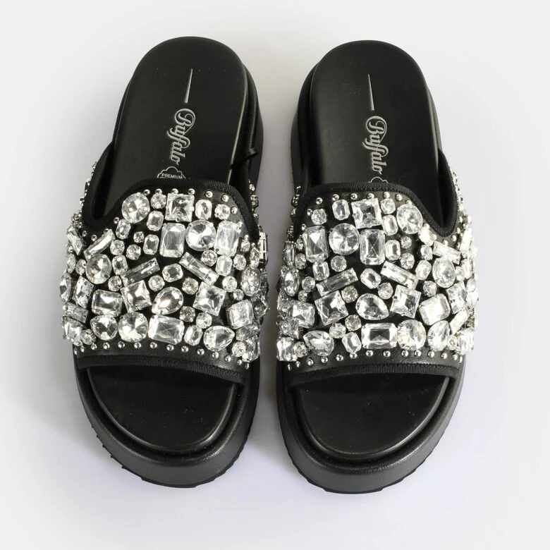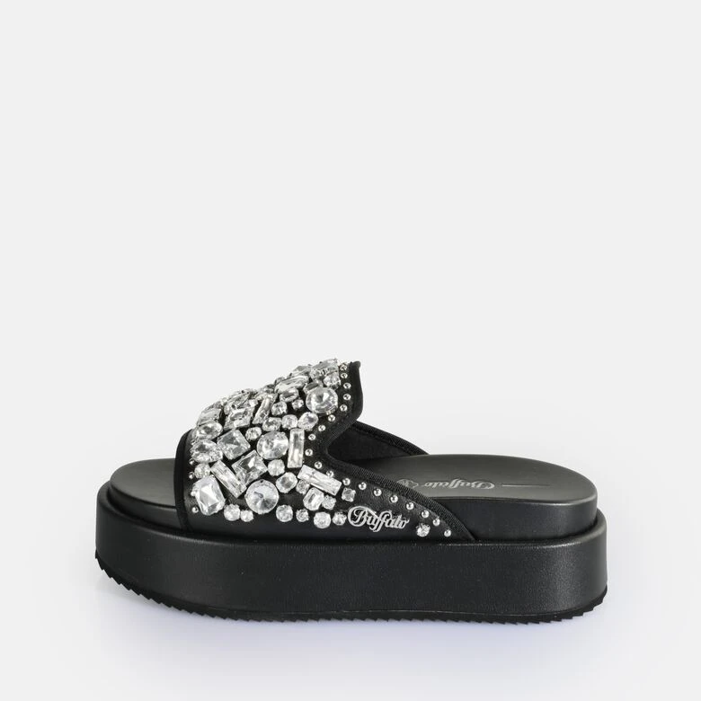 Einen eleganten Glamour verströmt die schwarze Noa Glam Slide Plateau-Sandale mit glitzernden Strass-Elementen. Sie bilden einen spannenden Kontrast zu der sportlichen Form der Pantolette mit durchgehend vier Zentimeter starker Chunky-Sohle. Alle für die Herstellung verwendeten Materialien sind vegan. Dabei verwöhnt die besonders leichte Pantolette Dich mit einer Innensohle aus Memory-Schaum und ihrem angenehmen Tragekomfort.