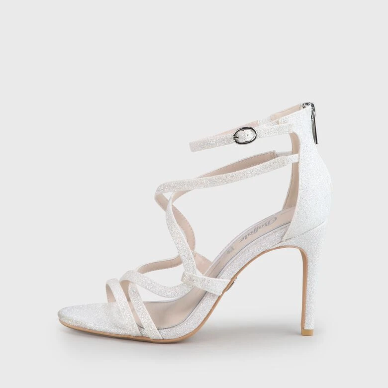 “Ja, ich will” sagst Du am Wedding Day als Braut auch zur eleganten Yvonne Sandalette, die Deinen Fuß mit zarten Riemen aus funkelndem weißen Glitter umschmeichelt. Dank Knöchelriemchen kannst Du die ganze Nacht tanzen und eure frisch besiegelte Liebe mit Style feiern.